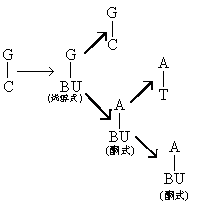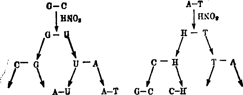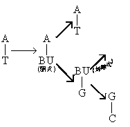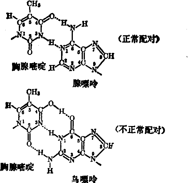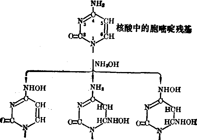 释义 | 化学诱变剂chemical mutagen能诱致基因或染色体发生突变的化学药剂。人工诱变上利用的主要有: 化学诱变剂 化学诱变剂化学诱变剂是指能使病毒提高其突变率的化学物质。 图1 胸腺嘧啶的正常配对和不正常配对 其他碱基如鸟嘌呤也可引起酮式-烯醇式转变。鸟嘌呤呈烯醇式时,可与胸腺嘧啶配对。然而,烯醇式的碱基在通常生理条件下是很少发生的,虽然如此,这种少见的结构为核苷酸置换及由此引起的突变提供了理论基础。化学诱变剂引起的碱基置换大多属转换(即由一种嘌呤置换另一种嘌呤或一种嘧啶置换另一种嘧啶)。化学诱变剂引起颠换(即嘌呤置换嘧啶或嘧啶置换嘌呤)却是少见的。有的化学诱变剂还可能引起移码突变,即DNA上缺失或嵌入一个(或多个)碱基后,核苷酸序列发生移位,移位后有时可使基因编码的蛋白质氨基酸序列全部发生改变。 下面列举一些能引起病毒突变的化学诱变剂及其诱变原理。 亚硝酸 能使病毒核酸中的碱基引起脱氨作用,对RNA病毒有很强的诱变作用。以(+)链RNA病毒为例(图2),亚硝酸使 (+)链RNA上的腺嘌呤(A)脱氨变为次黄嘌呤(H),在复制(-)链时,次黄嘌呤可与胞嘧啶(C)配对,进而在复制(+)链时,胞嘧啶与鸟嘌呤(G)配对,所以在子代(+)链RNA上,腺苷酸被鸟苷酸代替(图2a);胞嘧啶脱氨变成尿嘧啶(U),在复制(-)链时,尿嘧啶与腺嘌呤配对,进而复制(+)链时与尿嘧啶配对,因此在子代(+)链RNA上胞苷酸被尿苷酸代替(图2b);鸟嘌呤脱氨变成黄嘌呤(x),在复制(-)链时可与胞嘧啶配对,复制(+)链时与鸟嘌呤配对,因此在子代(+)链RNA上恢复成鸟苷酸(图2c)。然而,黄嘌呤在pH中性时,较易于电离,这可干扰碱基对形成 (即不能作为模板)而引起致死性作用。在双链DNA中的碱基脱氨后,在复制时以相同的原理,使G—C转换为A—T;A—T转换为G—C(图3)。亚硝酸对双链DNA诱变作用较小,这可能在双链DNA中,由于其碱基上的氨基不易与亚硝酸起作用之故。 图2 亚硝酸作用于(+)链RNA后的复制情况 图3 亚硝酸作用于双链DNA,复制后G—C变A—T,A—T变G—C 羟胺 也可使病毒发生突变。羟胺仅与嘧啶起反应,与嘌呤不起反应。羟胺与核酸中胞嘧啶作用后,可产生三种产物(图4)。一般认为羟胺与胞嘧啶第4碳上的氨基起作用形成的产物(图4左侧产物)可导致突变; 羟胺作用于胞嘧啶环第5、第6位上时,产生两种产物(图4右侧两种产物),可导致病毒失活。羟胺作用于胞嘧啶第4碳上的氨基时,由于羟胺衍生物的形成,使胞嘧啶与腺嘌呤配对,不是与鸟嘌呤配对。所以在DNA复制时,在G—C的位置上变为A—T。羟胺对DNA噬菌体S13等已证实有诱变作用。羟胺与尿嘧啶作用可破坏嘧啶环,而使病毒失活。 图4 羟胺与核酸中胞嘧啶作用后的产物 烷化剂 对病毒的诱变作用,如二甲基硫酸盐与TMV-RNA作用时,烷基主要作用于鸟嘌呤第7位的氮原子上,形成7-甲基鸟嘌呤,鸟嘌呤烷化后可引起异构转变而导致突变。烷化剂与双链DNA作用时,主要也作用于鸟嘌呤环的第7位的氮原子上,而引起异构转变,在复制时使碱基对改变,导致G—C转换为A—T。烷化剂甲基乙基磺胺与DNA作用时,鸟嘌呤环第7位上乙基化后可发生脱嘌呤作用,在复制发生前,脱嘌呤后所留下的空缺可被任何一个碱基填补,因此发生错误配对而引起突变。 碱基类似物 是在体内 (细胞内)作用于病毒的诱变剂。碱基类似物5-溴尿嘧啶(BU)是一种很强的诱变剂。BU与胸腺嘧啶相似,其5-溴基占的空间与胸腺嘧啶上的甲基所占空间很接近,所以易于取代胸腺嘧啶而渗入到DNA上。因BU中的5-溴基有较高的电子亲和力,所以易于使酮式BU转变成烯醇式BU。BU呈烯醇式时则可与鸟嘌呤配对,而不是与腺嘌呤配对。与酮式BU相比,实际上烯醇式BU是很少见的。BU引起的错误配对,可有两种形式的转换,一种称“底物转换”,即烯醇式BU为底物与鸟嘌呤配对而渗入至DNA链上,在复制时形成G—C转换为A—T(图5)。另一种形式的转换称“模板转换”,即酮式BU渗入DNA后,在DNA链上异构转变为烯醇式BU,则A—T转换为G—C(图6)。 图5 烯醇式BU为底物引起的错误配对(G—C变A—T) 图6 烯醇式BU为模板引起的错误配对(A—T变G—C) 插入性化学物质 如前黄素和6-氨基氮杂菲 (6-ami-nophenanthridine)等能插入至双链DNA邻近碱基对之间或与一个(也可多个)碱基结合,可引起突变,其机理尚不清楚,但很可能插入后可发生移码突变的缘故。插入性化学物质引起突变的现象,已在DNA噬菌体-细菌体系观察到。 以上列举的一系列诱变剂,除了有诱变作用外,可同时有病毒失活现象,而且使病毒失活的现象,往往是主要的。 ☚ 病毒的突变 病毒的重组 ☛ 化学诱变剂chemical mutagen |