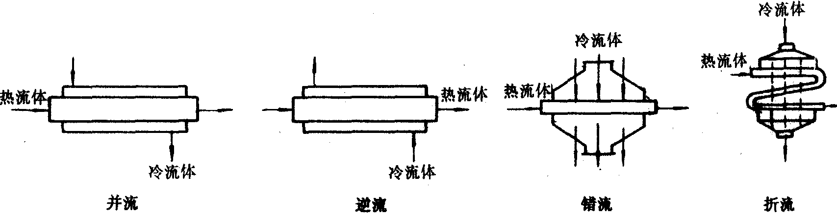 对于热量交换过程或物质传递过程而言,逆流较并流具有更大的平均推动力,即具有较大的温度差或平均浓度差。化学工艺过程中,大多采用逆流操作。但在某些情况下,则必须采用并流操作。此外,由于某种需要或流程设计和设备结构上的需要,还有采用错流和折流的。以热交换过程为例,各种操作流向见下图。
