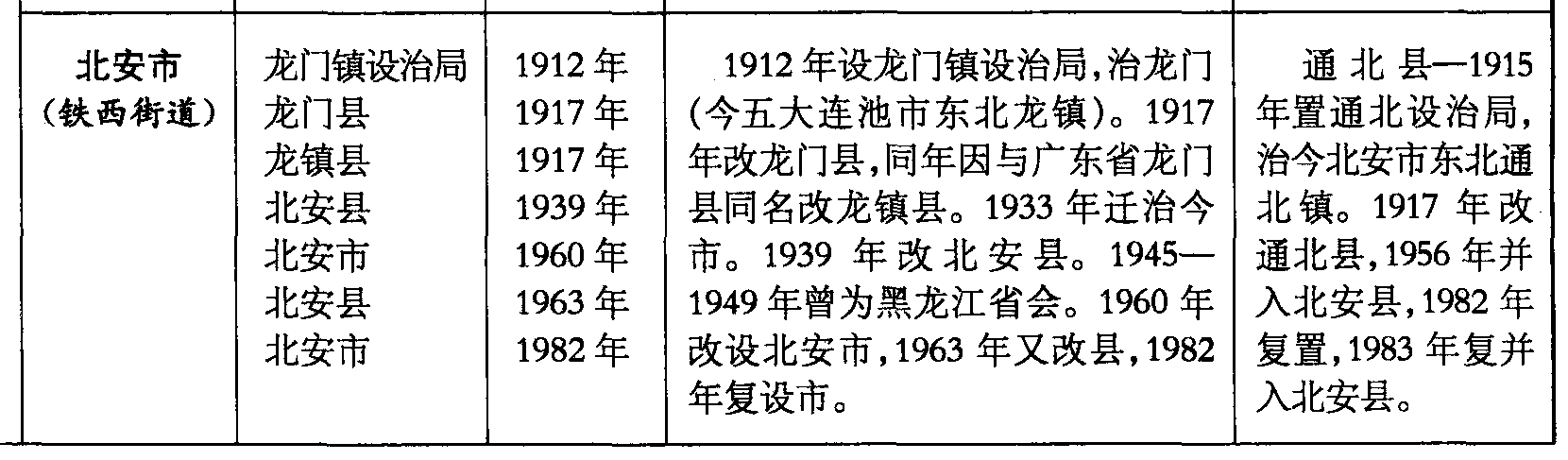 1912年设龙门镇设治局,治龙门(今五大连池市东北龙镇)。1917年改龙门县,同年因与广东省龙门县同名改龙镇县。1933年迁治今市。1939年改北安县。1945—1949年曾为黑龙江省会。1960年改设北安市,1963年又改县,1982年复设市。