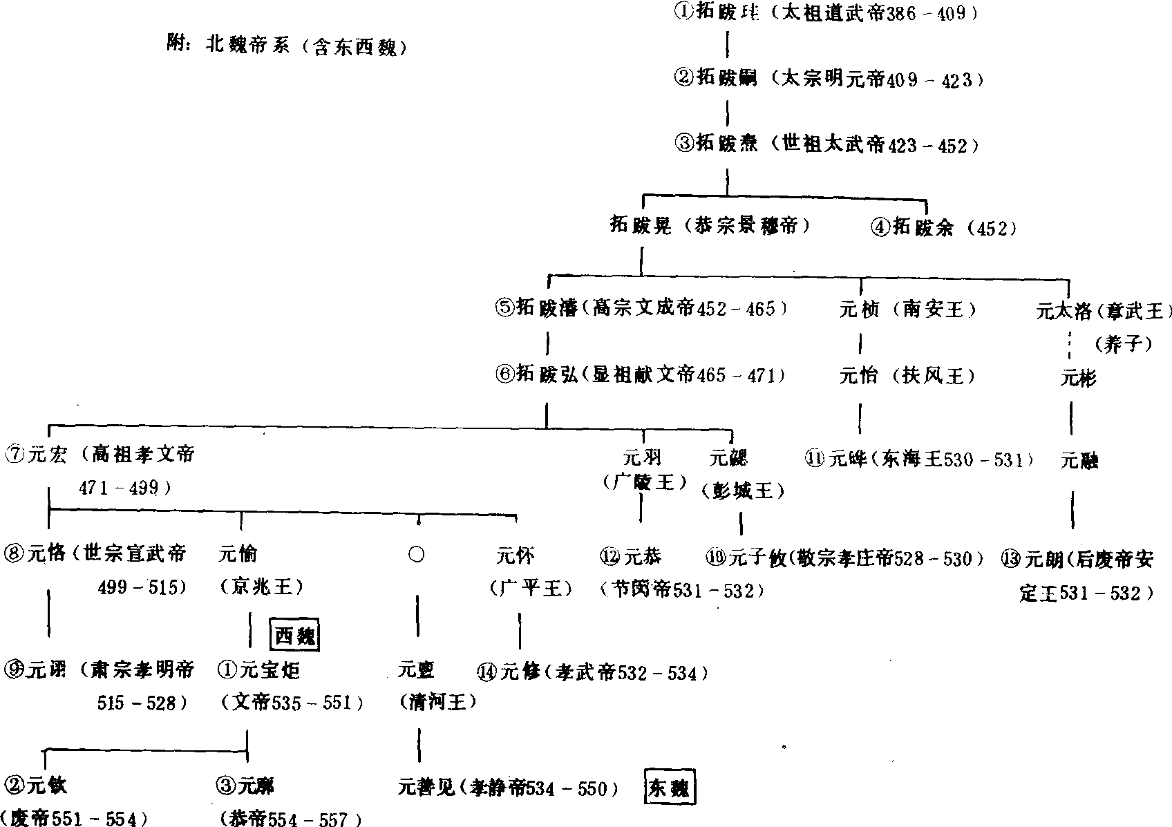 释义 | 韩延之/宗钦/元宏/高允/郑道昭/阳固/元子攸/元恭/崔鸿/冯元兴/萧综/董绍/卢元明/李骞/祖莹/李谐/常景/温子昇/胡叟/元晖业/元熙 ☚ 释洪偃 韩延之 ☛ 北魏、后魏【同义】总目录 北魏元魏 崔逞赐死案/崔浩国史狱案/段霸免为庶人案/翟黑子受布对不实案/源贺被人诬告案/许宗之诬杀马超案/张氏为婆私酿酒案/陈奇因才莸罪案/孙男玉杖杀夫仇案/彭老生杀未婚妻案/李洪之受纳案/苻承祖坐赃案/元干斩盗马人案/元恂擅杀被罪案/穆泰陆叡谋逆案/李冲擅禁李彪案/高遵贪酷案/张赦提纵妻受纳案/冯修谋毒冯诞案/邵安等诬告薛虎子反坐案/郦范为元伊利诬奏案/于洛侯严酷被诛案/孙益德为母复仇案/蛭拔寅兄弟争死案/长孙虑乞代父命案/胡泥酷滥纳贿案/赵霸酷暴免官案/元禧谋反案/赵修骄奢无礼案/元详被禁暴死案/赵和闻父丧辄还案/李崇断儿案/司马悦视鞘查凶案/宋翻留大枷案/李崇查匿逃兵役者案/侯刚掠杀羽林案/于谨诣阙归罪案/房景伯母子断不孝案/郦道元收诛丘念案/高谦之枷囚案/赵邕拷掠阳氏叔父至死案/寇㑺判讼田案/泉企判豪民案/高乾赐死案 ☚ 章华极谏被斩案 崔逞赐死案 ☛ 北魏亦称“后魏”、“拓跋魏”、“元魏”。朝代名。东晋太元元年(376),鲜卑拓跋氏所建代国为前秦苻坚所灭。后拓跋珪乘苻坚淝水之战兵败之机, 于太元十一年重建代国,称代王,旋改称魏王,史称北魏。初都盛乐(今内蒙古和林格尔附近)。相继击败库莫奚、高车、回纥、柔然、后燕等,势渐盛。天兴元年(398)迁都平城(今山西大同市东北), 并改号称帝。太武帝拓跋焘(423—452年在位)时,先后灭夏、北燕、北凉,尽有关中、辽河流域及凉州,复北败柔然,西逐吐谷浑,统一北方,与南朝对峙。孝文帝太和十七年(493)迁都洛阳,二十年改姓元氏,并立意改革鲜卑风俗、制度,实行汉化。疆域东北起辽西,西至新疆东部,南达淮南地,北至蒙古高原。永熙三年(534)分裂为东魏和西魏。550年东魏亡于北齐高洋,557年初西魏亡于北周宇文觉。自拓跋珪建立北魏始,共历十八帝,凡一百七十一年。 北魏北朝之一,鲜卑族拓跋 北魏 北魏386—534年北朝朝代名。公元4世纪初,在十六国大分裂期间,鲜卑拓跋部崛起于山西北部、内蒙古等地,建立代国,376年前秦苻坚灭代。淝水之战后,拓跋珪于386年又重建代国,称王,建元登国。同年改国号为魏,史称北魏,亦称后魏、拓跋魏、元魏。398年建都平城 (今山西大同),次年称帝。之后逐步灭后燕、夏、北燕、北凉,439年魏太武帝统一北方,与南朝对峙。493年魏孝文帝迁都洛阳,改姓元,北魏是中国民族大融合的重要时期。北魏初,拓跋部刚刚从部落联盟跨进阶级社会的门槛,在奴隶制尚未充分发展时,就走上封建化的道路,以适应统治中原的需要。北魏建立强有力的中央集权制,逐渐采用汉魏以来的政治制度,多方笼络汉族门阀,承认汉族地主荫占依附民,并视其为王朝的统治基础。这就是所谓 “宗主督护制”。但是,北魏前期的民族压迫还较严重,汉族人士受到猜忌,或被杀戮灭族。据史书记载,当时各族人民的反抗斗争有35起,其中以盖吴起义规模最大。北魏中期,冯太后实行政治、经济改革,颁行俸禄制,整顿吏治,实行三长制、均田制等。孝文帝亲政后,将都城迁到洛阳,并采取一系列改革鲜卑旧族、推行汉化的措施,加速北魏封建化进程,促进民族融合。社会经济有明显的发展。北魏末年,由六镇开始的各族人民大起义沉重打击着王朝统治。武泰元年 (528) 宫廷发生政变,秀容(今山西忻州) 的契胡族酋长尔朱荣带兵入京,在洛阳附近的河阴杀死胡太后以及王公大臣2000多人。史称 “河阴之变”。是后,北魏分裂为东魏、西魏。自拓跋珪建北魏到分裂,凡14主,历149年。 ☚ 南陈 东魏 ☛ 北魏拓跋鲜卑建立的国家。登国元年至永熙三年(386年~534年)。建元十二年(376年),前秦苻坚征服拓跋部。淝水之战后,前秦瓦解,拓跋珪趁机于登国元年(386年)在盛乐称代王,重建代国。同年,改国号为魏,史称 “北魏” 。拓跋珪在盛乐和河套地区积极兴立屯田,发展农业,国力不断强盛。天兴元年(398年)迁都平城(今山西大同)。后以汉族士族为官,采用封建统治方式,政权进一步巩固。先后吞并北燕、北凉,太延五年(439年)统一黄河流域和广大北方,与南朝形成对峙局面。北魏的疆域,以黄河流域为主体,东至海,西至新疆东部,北至蒙古高原,东北至辽宁西部,南至淮河流域。 北魏bei wei【历史】the Northern Wei Dynasty 北魏bei weithe Northern Wei(386~534) 北魏朝代名,南北朝时期北朝之一。也称“后魏”、“拓跋魏”、“元魏”。鲜卑拓跋氏所建。4世纪初,拓跋氏在今山西北部、内蒙古中部等地建立※代国,东晋太元元年(代建国三十九年,376),为前秦苻坚所灭。十一年(386),原代王拓跋什翼健孙※拓跋珪乘苻坚淝水之战兵败之机重建代国,称代王,年号登国,旋改为魏王,史称北魏。初都盛乐(今内蒙古和林格尔西北土城子)。相继击败库莫奚、高车、柔然及后燕等,势渐强。天兴元年(398),迁都平城(今山西大同市东北),称帝,改元天兴。广泛招纳人才,起用汉族士人,效法中原王朝,制定典章制度,建省台,置百官,立爵品,正封畿,定律令,申科禁,劝课农桑,屯田垦荒,兴办学校,巩固了国家统治。其孙太武帝※拓跋焘时,先后灭夏、北燕、北凉,尽有关中、辽河流域及凉州,复北败柔然、高车,西逐吐谷浑,统一北方,兵锋直抵瓜步(今江