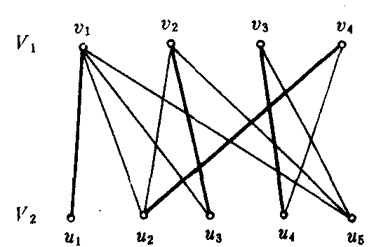 释义 | 匹配pǐpèi❶结成婚姻;婚配 匹配pǐpèi❶ 〈动〉婚配,结为夫妇:匹配良缘。 匹配pǐ pèi配合;相当。1955年1月《无线电》第1期:“换个更灵敏的微音器,或是多装几个扬声器,很显然的都不能使电力输出增加,只有更提高杂音电平,破坏输出回路匹配情况,因而使情况更加恶化。” 婚配 婚配合(合配;天作之~) 妃(妃合)侪 匹配 齐体 门对 会对 偕偶 衿禬 欢合 鹊驾银河 ☚ 结婚 娶妻 ☛ 能够相比 能够相比如(莫~;自愧不~) 及(~格) 若 朋 媲(媲美;媲敌;媲配;相媲) 匹(匹比;匹配;匹敌;匹俦;为匹;相匹) 配(配享;相配;般配;配得上) 亚 逮 顶 抗(抗衡) 方比 伦比 敌耦 相当 及得上 ☚ 相比 不能相比 ☛ 结婚 结婚婚(婚媾;婚娶;婚会;婚对;婚耦;缔婚;成婚) 配(配匹;配偶;配属;配合;饰配) 媾 亲(成亲;继亲;结亲;做亲;就亲)偶(偶成;偶合;匹偶;偕偶) 妃齐体 成合 成房 成昏 成礼 成婣 成结 结发 结合 合好 合婚 合姓 合卺 合室 合匏 连理(连理杯;连理盘) 花烛 同衾 姻好 姻连 姻嫁 姻懿 匹配 匹敌 饰配 上头 结姻 跨凤 作合 束薪 结丝萝 办喜事 鹊驾银河 花烛红妆 同床共枕 另见:恋爱 日子 结合 仪式 婚礼 夫妻 感情 成家 过生活 ☚ 结婚 婚配 ☛ 匹配 匹配对夫妻成婚的代称。“配”,即配对,配偶。 ☚ 花烛 出阁 ☛ 匹配 匹配pipei一个图中互不邻接的边的集合.设图G=〈V,E〉若M⊆E,且M中任二边均无公共端点(不邻接),则称M是G的一个匹配(也称为边无关集或对集);M的边的端点称为(G关于M的)M-饱和点,G的其它点称为M-非饱合点.例如图,有M={e2,e4,e8},M1={e3,e7},M2={e1,e7}都是G的匹配.而M-饱和点是v1,v3,v2,v4,v5,v6;M1-饱和点为v2、v3、v4、v5;M2-饱和点为v1、v2、v4、v5. K3.3 若G的所有点都是(匹配M的) M-饱和点,则称M是G的一个完美匹配(完美边无关集).若G有完美匹配,则G必有偶数个点.显然逆命题不一定成立. 上面图G中,M是一个完美匹配.而M1,M2都不是完美匹配.而下图G1没有完美匹配. G1 若M是G的匹配,并且不存在匹配M′,使|M′|>|M|,则称M是G的最大匹配. G的完美匹配是G的最大匹配.其逆不真. 上图G1,{e1,e4,},{e3,e5},{e3,e6}都是G1的最大匹配,而G1没有完美匹配. 若G=〈V1,V2;E〉是二分图,V1={v1,v2,…,vp},V1对V2的匹配指的是G的子图,边为v1u1,v2u2,…,vpup是G的边,且u1,u2,…,up是V2中不同的点. G 例如图,其中的粗线表示的是G中V1对V2的一个匹配. 许多实际问题可化为在二分图中求匹配的问题.有m个工作人员及n件工作的单位,每个人只熟悉其中若干件工作,而每件工作都需要一个人去干.能否将这n件工作分配给熟悉它的人去干?用V1={v1,v2,…,vm},V2={u1,u2,…,un}表示人与工作的集合,vi熟悉工作uj,则viuj为边.则得到二分图.于是问题化为:能否在这个二分图中,找出V1对V2的匹配. 定理:设G=〈V1,V2;E〉.G中存在V1对V2的匹配,当且仅当V1中任意k点(k=1,2,…|V1|)至少和V2中k个点相邻接(该条件称为相异性条件). 定理:设G=〈V1,V2;E〉.若存在正整数t,并且: ❶对V1中每个点,至少有t条边(即度数≥t); ❷对V2中每个点,至多有t条边(即度数≤t);则G具有V1对V2的匹配.例如二分图G G t=2,对V1的每个点v,适合d(v)≥2,而对于V2的每个点u,d(u)=2.存在V1对V2的匹配(粗线表示的就是一个).☚ 二分图 树 ☛ 匹配在情报检索中,用户需求的表达与其需求间的一致性以及与检出情报的内容的相关性。 匹配无线电元件之间或其他部件之间的配合。如阻抗匹配;进气道发动机匹配。 匹配mate; marry; match |