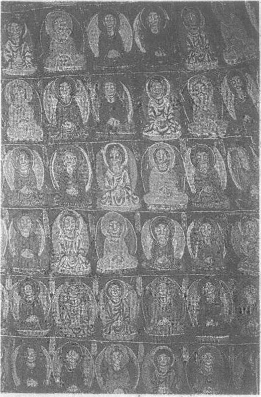 释义 | 千佛图壁画 千佛图壁画北凉。甘肃省肃南裕固族自治县文殊山石窟千佛洞西、南壁角壁画。壁面上方整齐地绘列着一排排坐佛,圆脸、大目、高鼻,面部多带平易近人的微笑,显得十分和善。身着各色通肩袈裟,结跏趺坐于莲座之上,双手放置腹前,作禅定印,身后的背光与袈裟颜色相配。壁面最底层绘一排立佛,其面形与上部的坐佛类似,双耳尤大,两腿分开站于莲台之上。此图风格古拙挺健,敦厚朴实,设色浓厚,人物肌肤的裸露部分,如脸颊、双目、颈部皆施以朱红晕染,以增强人物的立体感。作者在绘画时还注意人物特征的描绘,使初看基本相同的人物形象,实际有所变化。 ☚ 飞天像壁画 菩萨像壁画 ☛ |