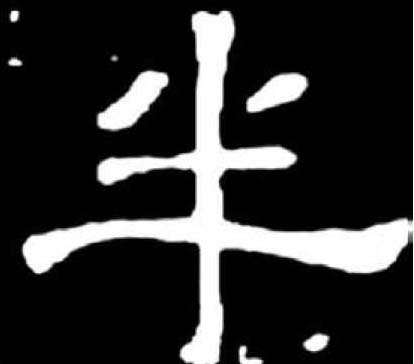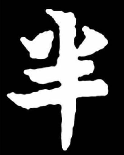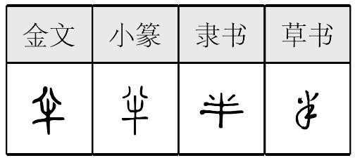 ❹得失参半|毁誉参半|事倍功半 半bàn《说文》:“半,物中分也。”会意字。作声符生成的字有: bàn 伴(伙伴) 拌(搅拌) 绊(羁绊) pan 阳平:胖(心宽体胖;另读pàng) 去声:判(判断) 叛(背叛) 畔(河畔) 泮、袢 pàng 胖(肥胖) 半 金文; 篆bàn[八(聲符)+牛(意符)→半(《説文》:“半,物中分也。從八從牛。牛爲物大,可以分也。凡半之屬皆從半。”半,二分之一:半圓;半百。不完全的:多半;半島;半透明;半脱産。在中間:半空;半路上;半夜。很少:一星半點。)] 《孟子·公孫丑上》:“故事半之古人,功必倍之。”(比起古人,事半功倍。) 嚴復《救亡决論》:“從此天下事來。吾〈我〉以半部《論語》治之足矣,又何疑哉!又何難哉!”(嚴復提出的“半部《論語》治天下”,有人認爲“一部《論語》治天下豈不更好?”《論語》是孔子語録。書中很多至理名言,迄今不朽。但孔子相距我們已兩千五百多年,其中又有許多不合當今的實際。所以嚴復的“半部《論語》治天下”論,是比較科學的。) 半(bàn)“ ,物中分也。从八,从牛。牛为物大,可以分也。凡半之属皆从半。”(博幔切) 甲骨文中未见“半”字。秦公簋作 ,从牛从八会意。这里“八”不是数字,而是分别、分割的意思。故“半”之构字意图是“分割牛”。朱骏声说“半”是“判”的本字。《说文·四下·刀部》:“判,分也。”凡宰杀牲畜,习惯都是以脊骨为界将牲体一分为大小相等的两部分,故“半”引申有二分之一义。如秦公簋:“□一斗七升大半升,盖。”半升为二分之一升,大半升为三分之二升。[1]或说“半”是“胖”的本字。徐灏《注笺》:“半即肥胖本字,所谓广肉也。牛为物大,夹脊肉多,故从牛从八。……后为半义所专,又增肉旁作胖,实本一字。” 半部只有“胖、叛”两个属字。“半”也可表音,常作声符,如“拌、伴、绊、畔”等。后世一般的字典、词典不立“半”部。 半 bàn(5画)