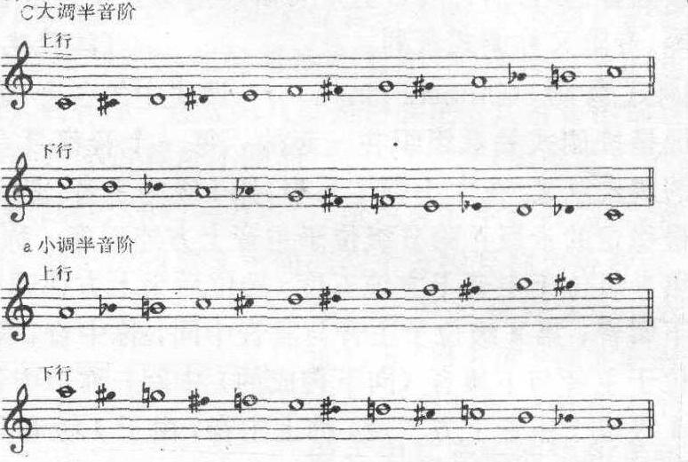 简称半音阶。音阶中相邻各音均为半音。半音音阶的记谱法一般上行时用升号。如: