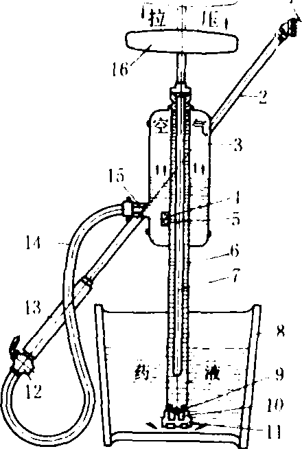 释义 | 单管喷雾器bucket pump sprayer一种不带药液箱的手动液力喷雾器。由手动柱塞泵和喷射部件组成。具有操作简便,工作压力较高,不易出故障的特点。中国于1941年开始引进与生产,到50年代至60年代中期已较普遍用于棉田、菜地、果园等病虫害的防治作业。 单管喷雾器 1.喷头;2. 手持喷杆;3. 气室;4、9.球阀;5. 出水阀;6.唧筒管;7. 塞杆;8. 药液桶;10. 进水阀; 11. 吸水座;12.截流阀;13.滤网套管;14.喷雾软管;15. 出水接头;16. 木柄 |
