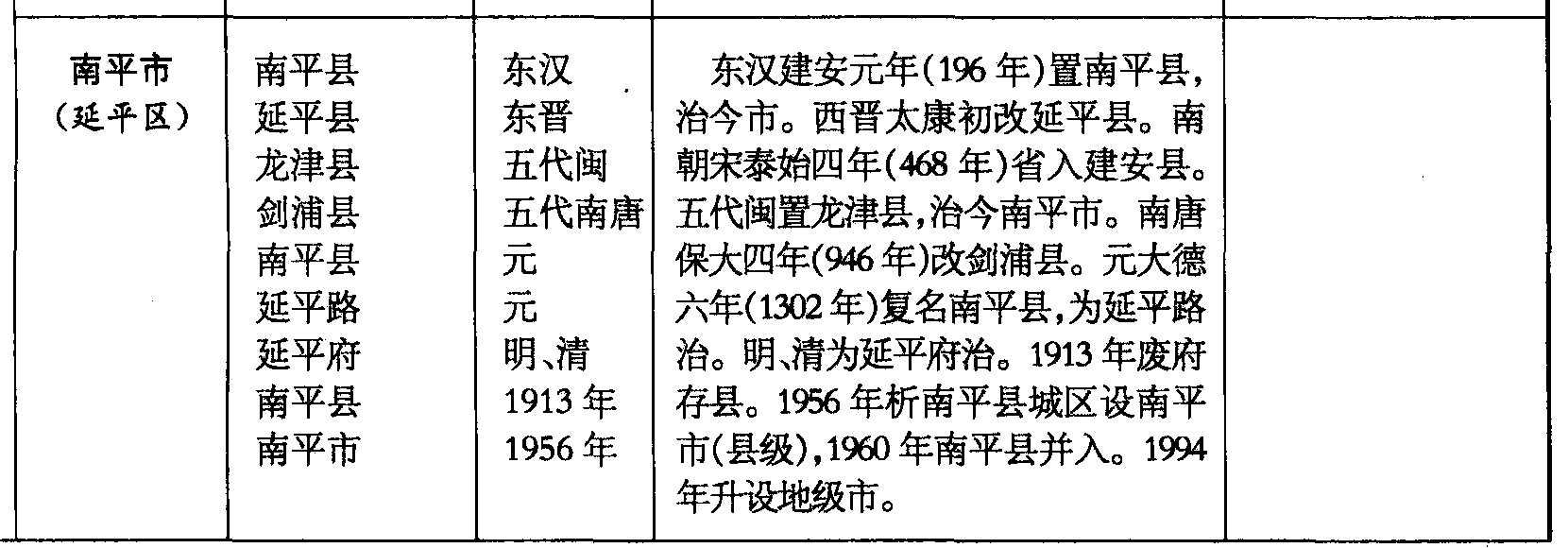 南平市(延平区)南平县延平县龙津县剑浦县南平县延平路延平府南平县南平市东汉东晋五代闽五代南唐元元明、清1913年1956年东汉建安元年(196年)置南平县,治今市。西晋太康初改延平县。南朝宋泰始四年(468年)省入建安县。五代闽置龙津县,治今南平市。南唐保大四年(946年)改剑浦县。元大德六年(1302年)复名南平县,为延平路治。明、清为延平府治。1913年废府存县。1956年析南平县城区设南平市(县级),1960年南平县并入。1994年升设地级市。