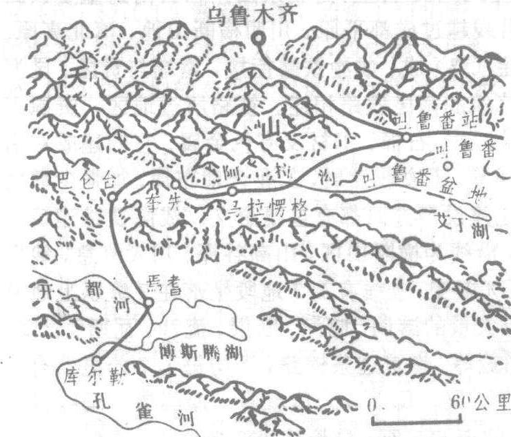 新疆南部主要铁路干线。从吐鲁番至库尔勒,全长474公里。在吐鲁番与兰新铁路相交。西端将要延筑到喀什。1989年筑至库尔勒并已正式营业。这条铁路基本沿古“丝绸之路”的中路延伸,沿线地质、地貌、气候条件十分复杂,有45℃的高温戈壁沙漠,有零下三四十度的冰达板,还有常年刮着七八级强风的大风口。全线一半以上地段穿行于天山峡谷,修建隧道29座,架设桥梁463座,隧道总长为50余公里。特别是奎先达板段,海拔升至3 000米以上,这里建有7座螺旋形隧道,其中奎先隧道长6公里。在100公里地段,火车要25次跨越狭沟桥梁。铁路进入焉耆盆地后,还要跨越流沙河,铁桥长达438米。南疆铁路的筑通,大大改善了天山南北的交通,为塔里木盆地经济开发和继续修建铁路奠定了基础。