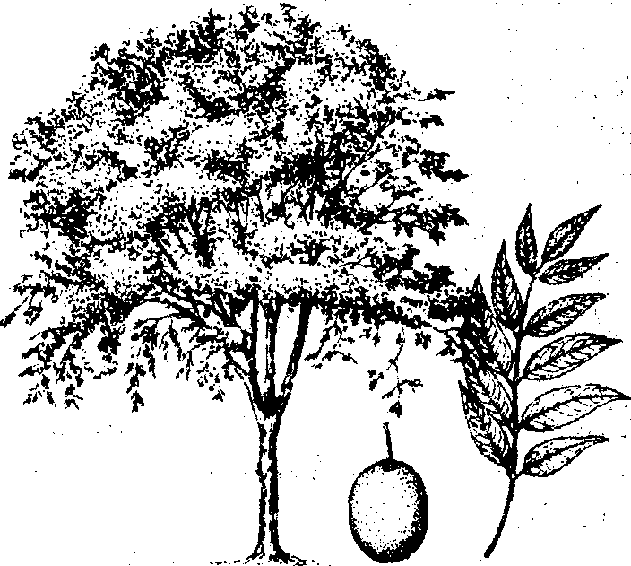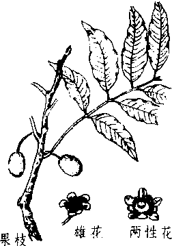 南酸枣axillary choerospondiasChoerospondias axillaris (Roxb.)Burtt et Hill ,又称酸枣、五眼果。漆树科,南酸枣属。落叶乔木。高20~30m,胸径1.5m。奇数羽状复叶,长20~30cm;小叶3~7对,卵状披针形,长4~10cm,宽2~4.5cm,全缘,基部不对称。雄花和杂性花排成聚伞状圆锥花序;雌花单生叶腋;花杂性异株,淡紫红色,5出数。核果椭圆形,长2~3 cm。种子顶端有5个小孔。分布于华东、华中、西南各省区;日本、印度、中南半岛也有分布。喜光,适应性较强,速生。木材纹理直,加工性能好,花纹美丽,可供建筑、家具等用材。树皮及果入药,治火烫伤。果可食。