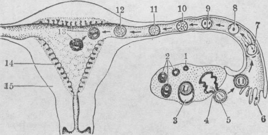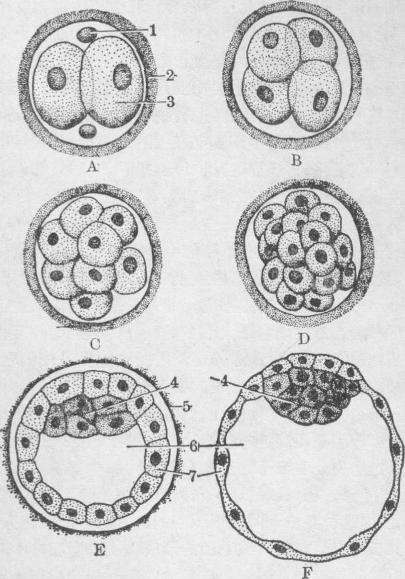 释义 | 卵裂与胚泡的形成 卵裂与胚泡的形成卵裂和胚泡形成是卵子受精后的两个连续发育过程或阶段,前者为受精卵在输卵管中连续分裂形成桑子状桑椹胚的阶段;后者为桑椹胚到达子宫腔后渗入子宫液形成具有囊腔的囊胚的形成过程。 图1 卵巢周期、受精及人胚第一周的发育图解 1.初级卵泡 2.生长卵泡 3.成熟卵泡 4.排卵5.次级卵母细胞 6.输卵管伞 7.受精 8.合子9.2细胞期 10.4细胞期 11.8细胞期 12.桑椹胚期 13.胚泡 14.子宫内膜 15.子宫肌层 早期卵裂球仍具有全能发育的潜能,将2细胞期的卵裂球分开,或将桑椹胚分为二半后,每半均可演变为一个全胚。人类同卵挛生和连体怪胎可能和卵裂期或胚泡内细胞团不正常的裂分为二有关(估计约有25~30%是由于2细胞期卵裂球分离造成的结果)。 胚泡的形成 胚泡也称囊胚。桑椹胚在子宫腔中继续分裂,使细胞数量增多,同时宫腔中的分泌液通过透明带渗入细胞间而逐渐形成一囊腔,称为囊胚腔或胚泡腔。囊腔的增大,使细胞分为二部分,包围在胚泡腔外的为扁平细胞层,该层与取得母体营养有关,将演变为胎盘的一部,称为滋养层;位于动物极中央的细胞,集聚成团,将演变为胚体和一部分胎膜,称为内细胞团,或称胚结(图2)。这一时期的胚胎称为囊胚,在哺乳类通称为胚泡,为受精后4~4.5天的胚胎。随着子宫液渗入量增多,胚泡腔增大,内细胞团便偏位于一侧,整个胚泡的体积增大至0.25 mm。子宫分泌液中含有糖原及粘多糖等物质,为植入前胚泡的营养来源,又称为“子宫乳”。胚泡到达子宫腔2天后(5天胎龄),透明带消失,胚泡的滋养层细胞便直接与子宫内膜接触。5~6天胎龄的胚泡,由于滋养层的动物极一端细胞的粘性,胚泡内细胞团一端的滋养细胞与子宫内膜上皮紧密接触。在第7天时,滋养层细胞增殖侵生,扩大表面植入的范围,开始作植入子宫内膜的准备。 图2 卵裂及胚泡形成模式图(自Moore) A.二细胞期 B.四细胞期 C.八细胞期 D.桑椹胚期 E.胚泡早期 F.胚泡晚期 1.极体 2.透明带 3.卵裂球 4.内细胞团5.退化中的透明带 6.胚泡腔 7.滋养层 ☚ 受精 胚泡的着床与植入 ☛ |