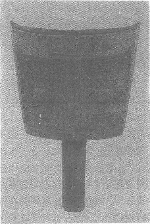 西周。打击乐器。通高46厘米,柄长19.5厘米,柄端直径5.5厘米,铣间宽31厘米,器壁厚1厘米。重32公斤。1974年江苏省江宁县横溪塘东村出土。江苏省南京博物院藏。此铜铙呈铜绿色。柄与器身内腔相通,器身断面略呈椭圆形,手部略向内收成弧形。从器身表面看,纹饰较为清晰,由粗卷云纹、细卷云纹、连珠纹(圆圈纹)组成,并由多组卷云纹构成兽面形式,似脱胎于商代的饕餮形象,但已超图案化,满布连珠纹衬底,纹皆平雕,唯双目突出。鼓部中央饰小型兽面。兽面两侧、中间和下部各饰成行的卷云纹。舞部亦为卷云纹图案。该铜铙的年代相当于西周早期。铙是一种形似铃而又易被误识为钲的打击乐器。《周礼·鼓人》:“铙如铃,无舌,有柄,执而鸣之,以止击鼓。”铙使用时,口朝上,因用手执,故也常称之为执钟。但特大的铙,只能扦在座上敲打。