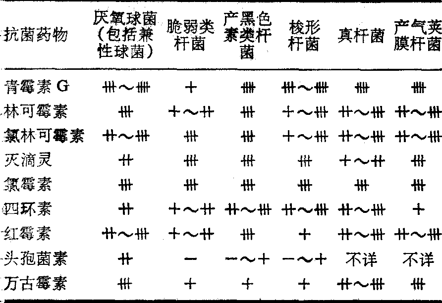 近年厌氧菌对四环素耐药者普遍增加,红霉素对厌氧菌的抗菌活性不稳定,头孢菌素族的抗菌活性不如青霉素族,因此这些抗生素在厌氧菌感染中均很少用。利福平虽对多数厌氧菌均具抗菌活性,但因细菌易产生耐药性,故不宜单独采用。杆菌肽对产黑色素类杆菌有强大杀菌作用,万古霉素对厌氧球菌有良好抗菌活性,多粘菌素对某些梭形杆菌和某些类杆菌(脆弱类杆菌除外)具较好抗菌作用,可依药敏结果而加选用。氨基甙类抗生素对厌氧菌无抗菌活性。