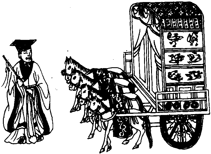 厭翟車 (《周禮文物大全圖》) 厌翟yā dí后妃,公主所乘的车。以翟羽为饰,故称。《周礼·春官·巾车》“厌翟勒面缋总”注:“~~,后从王宾飨诸侯所乘。” |