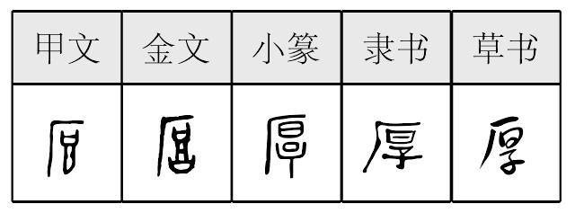 ☚ 覃 畗部 ☛ 厚hòu甲骨文和西周金文中是会意字。从厂(本读hǎn,本山岩形),从倒享(亯)。享本象宗庙形,祭祀供奉;厂也代表房屋。在房中不奉人而自奉,有丰厚、富厚义。《说文》说倒“享”字就是厚字。引申为长宽厚的厚。又是厚薄的厚。又表示深、重、浓、大义。如:厚望|厚味。又引申为不刻薄,待人好。如:厚道。 厚★常◎常