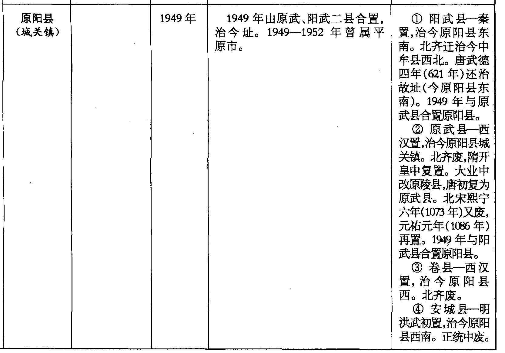 原阳县(城关镇)1949年1949年由原武、阳武二县合置,治今址。1949—1952年曾属平原市。❶ 阳武县—秦置,治今原阳县东南。北齐迁治今中牟县西北。唐武德四年(621年)还治故址(今原阳县东南)。1949年与原武县合置原阳县。❷ 原武县—西汉置,治今原阳县城关镇。北齐废,隋开皇中复置。大业中改原陵县,唐初复为原武县。北宋熙宁六年(1073年)又废,元祐元年(1086年)再置。1949年与阳武县合置原阳县。❸ 卷县—西汉置,治今原阳县西。北齐废。❹ 安城县—明洪武初置,治今原阳县西南。正统中废。