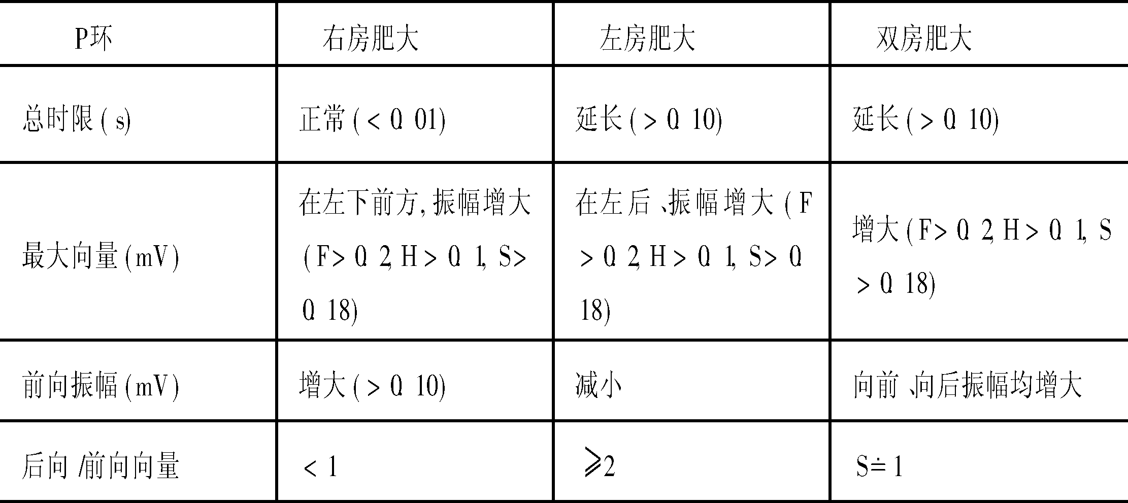❶P环总时间延长大于100ms。❷P环向前及向后向量均增大,且超过正常值。❸P环呈顺钟向运转,在右侧面出现一个三角形的P形。❹P环最大向量振幅增大,P环开放,Ta向量位于右后上方。参见下表。