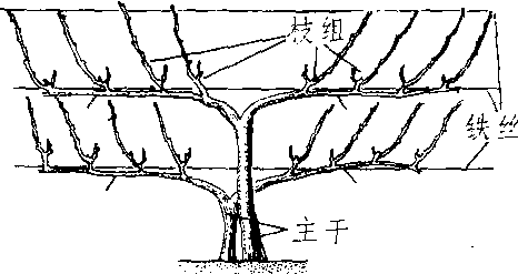 释义 | 双臂水平形整形twoarm horizontal cordons training篱架葡萄常用的一种整枝形式。分单层双臂和双层双臂等树形,以后者应用较广。双层双臂水平形整形时,植株常具主干1~2个,由每个主干上再分生出两个主蔓,诱引到左右侧铁丝上作水平绑缚,分上下两层,俗称臂。枝组配置于各主蔓上,相距20~25 cm,每年作规则式修剪。本形整形技术简便,枝梢和果穗在架面上分布均匀,便于管理,结果部位相对稳定,树势易均衡。 双层双臂水平形整形 |