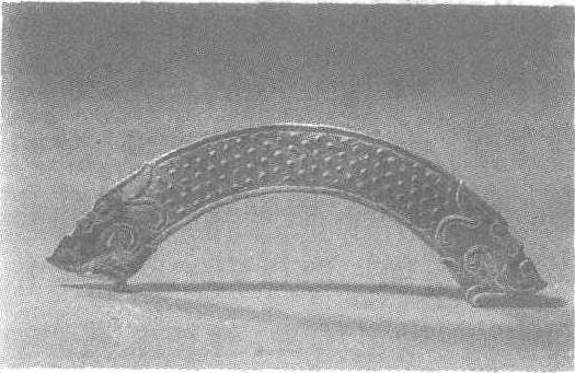释义 | 双龙首玉璜 双龙首玉璜战国晚期。长17.5厘米,肉宽3厘米,厚0.4厘米。1977年安徽省长丰县杨公乡墓葬出土。安徽省博物馆藏。玉料为青玉,体扁平呈弧形,两面均饰纹。璜两端各镂雕一张口露齿的龙首侧面像。璜身满饰阴线勾连云纹和剔地谷粒纹,边缘刻弦纹一周,上部正中有一圆穿。常见的璜两端多雕龙形,与古籍所记虹饮之说有关。《汉书·燕王旦传》。“是时天雨,虹下属宫中,饮井水,水泉竭”。据此推断,璜是模仿虹的形状而来的。玉璜见“鸟兽纹玉璜”条目。 ☚ 双凤纹玉璜 龙形玉觿 ☛ |