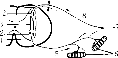 释义 | 反射弧reflex arc完成反射活动所必需的解剖学基础,包括感受器、传入神经、神经中枢、传出神经和效应器5个基本组成部分。感受器接受刺激而产生兴奋;兴奋以神经冲动的形式通过传入神经至神经中枢;再通过神经中枢对传入的信息进行处理(分析和综合活动);然后发出信号经传出神经到达效应器,引起相应的活动(如肌肉收缩,腺体分泌等)。最简单的反射弧在中枢部分只交换一次神经元,也就是在中枢神经系统内只经过一个突触传递,称单突触反射(如膝跳反射和跟腱反射)。但多数反射弧在传入神经元与传出神经元之间还要通过数目不等的中间神经元,也就是要通过多次的突触传递,称多突触反射。 反射弧 1.传入神经元 2. 突触 3. 中间神经元 4. 传出神经元 5. 传出纤维 6. 效应器 7. 感受器 8. 传入纤维 反射弧 反射弧fanshehu实现反射活动的神经结构。由感受器、传入神经、神经中枢、传出神经、效应器五个部分组成。神经系统的活动是各种各样简单或复杂的反射活动,反射弧的结构也有简有繁。在最简单的反射弧中,传入神经元和传出神经元直接在中枢内接触,称为单突触反射,如膝反射。复杂的反射弧有许多中间神经元,神经元的连接方式主要有:(1)辐散式: 一个神经元的轴突可与许多不同神经元建立突触联系;(2)聚合式: 一个神经元的胞体与树突接受许多不同神经元的突触联系;(3)链锁状:神经元链状接替。由于中枢神经系统内神经元的结构与神经元间联系的复杂性,使各种反射活动能互相配合,互相协调而精确地进行。 ☚ 反射 传入神经元 ☛ 反射弧 反射弧fanshehu实现反射的神经结构。由感受器、传入神经、神经系统的中枢、传出神经、效应器五个基本部分组成。感受器是生物学的换能器,它把一种形式的能改变为另一种形式的能。传入通路有两条:特异传导通路,即各种感受器接受特定的刺激信息后,发放神经冲动,经过某种传导途径,传到大脑皮层的相应区域,因而产生某种感觉;非特异传导通路,即神经冲动通过网状结构弥散性地投射到大脑皮层的广泛区域。传出通路也有两条:锥体系和锥体外系。效应器发出相应的活动。实际上,任何一个比较复杂的反射活动都不是一次单向传导所能完成的,中枢神经系统通过反馈对效应器的活动进行调节,从这个意义上来讲,反射活动的机能结构应该是一种“环形”结构。 ☚ 植物性神经 刺激 ☛ 反射弧reflex arc系完成反射活动的结构。人和高级动物完成各种生理活动均由其完整的反射弧来实现的。一个完整的反射弧包括:感受器、传入神经、神经中枢、传出神经、效应器等5个环节组成,有的高级、复杂的反射活动,其中枢神经部分还可有高级部分控制。反射弧各个环节协调配合,缺一不可,才能实现其反射活动。 反射弧见“医药卫生”中的“反射弧”。 反射弧反射活动的结构基础。包括感受器、传入神经、神经中枢、传出神经和效应器。反射过程:一定刺激被一定的感受器所感受,并发生兴奋,以神经冲动的方式经传入神经传到中枢,由中枢分析与综合产生兴奋过程,由一定的传出神经传到效应器发生相应的活动。 反射弧 反射弧神经系在调节机体适应环境的活动中,对内、外环境的刺激作出适宜的反应,这种神经调节过程称为反射。反射活动的解剖学基础是反射弧。反射弧包括感受器→感觉神经纤维→中枢→运动神经纤维→效应器五个部分。反射的分类方法较多。依据反射弧在脊髓联系节段的多寡可分为节内反射、节间反射和超节反射。若按反射弧中所经过突触的多少,可分为单突触反射和双突触反射。为适应临床的应用,可分为浅反射、深反射、内脏反射和病理反射。例如角膜反射、髌腱反射、颈动脉窦反射和Babinski反射。依据反射的建立方式,可分为先天性的非条件反射和后天获得的条件反射,后者可使人类和高等动物更精确地适应环境的变化。 ☚ 神经纤维和神经 脊神经 ☛ 反射弧 反射弧reflex arc完成反射的结构基础。由感受器→传入神经→神经中枢→传出神经→效应器五个环节组成。其中任何一个环节受损或缺失则反射不能实现。 ☚ 反射 条件反射 ☛ 反射弧 反射弧reflex arc完成反射活动的结构基础,它由五个部分组成: (1)感受器,即接受刺激的起始处,有感受刺激、产生兴奋(神经冲动)的功能。(2)传入神经,即来自感受器的神经冲动经传入神经传向中枢。(3)中枢(脑和脊髓内的神经元),即接受传入神经传来的神经冲动,经过分析综合之后,将冲动传出中枢。(4)传出神经,即将中枢发出的神经冲动传给效应器。(5)效应器,即传递神经冲动,使肌肉和腺体产生反应的器官。反射弧的结构有简有繁,最简单的反射弧由两个神经元连结组成,如膝跳反射;复杂的反射弧可由多个神经元组成,在反射中涉及的中间神经元越多,所产生的反射活动就越复杂,如学习、思维活动。在大多数情况下,神经冲动的传导不是单向的,不仅存在着“感受器-中枢-效应器”这个方向的传导,而且存在着“效应器-中枢-感受器”这个方向的传导。因此,神经冲动沿着一条闭合的神经环路前进。这条闭合的神经环路称为反射环。效应器活动的信息回到中枢,称为反馈信息; 中枢根据反馈信息进一步调节效应器活动,称为反馈调节。正是由于神经系统的反馈调节作用,才保证了反射活动的正确性和有效性。 ☚ 反射 反向条件作用 ☛ 反