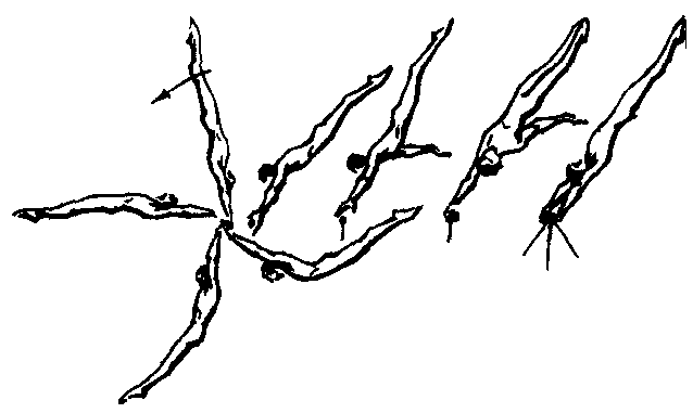 单杠低难度动作 之一。技术 要点:手倒立前翻下摆“沉肩”的技术同向前大回环。过杠下垂面后,顺势压杠,含胸,提腰动作强度弱、幅度小,当重心上摆过杠水平时,两手轻带松开,随即左手换成正握,成右臂侧举身体稍右转的单臂上摆,随后右臂靠向体侧,同时头向左腋下猛扣并转体。紧接右臂上举头后掏杠成深握。然后脚面远伸,顶肩低头,含胸紧髋下摆。刚开始时应多做反握倒立前翻后摆到肩轴上升至杠水平面时,左手换成正握,正反握上摆跳下。进而要求到杠水平面两手同时松杠,立即左手换成正握上摆跳下。当“松手”、“换握”的技术熟练后,就可直接练习。保护者位于转体同侧高位上,两手托髋,助其转体。
