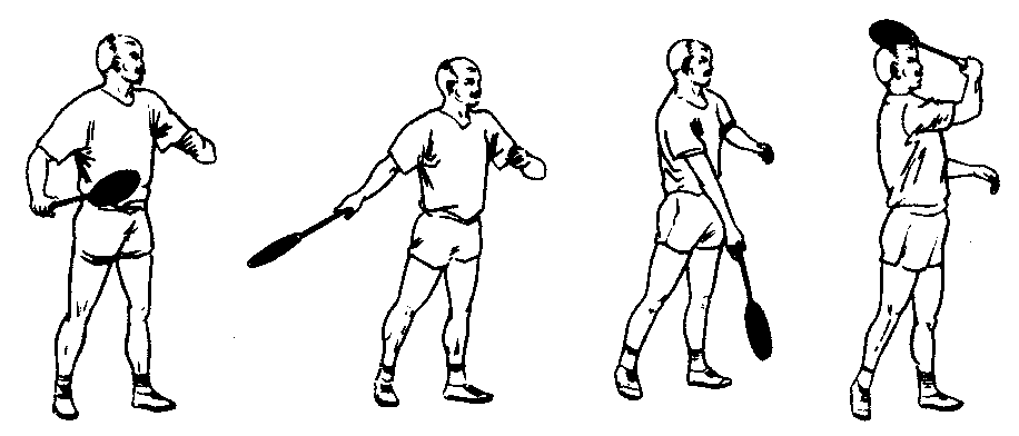是羽毛球基本技术之一。发球质量的好坏,直接关系到比赛的主动或被动,与比赛胜负有很大关系。发球有正手和反手两种方法。根据球在空中飞行的弧线,可分为发高远球、平高球、平快球和网前球等。发球首先要选好站位。单打应站在贴近中线距前发球线约1米处;双打可稍靠前一些。正手发球时(以右手握拍为例),身体侧对球网约成45°。两脚自然开立与肩同宽,左脚在前,脚尖指向发球方向,右脚在后,身体重心落在右脚上。右手握拍向后侧举起,左手屈肘,用拇指、食指和中指轻轻地夹持球托与羽毛相接处置于胸腹前。挥拍时,手臂由后向前划弧摆动逐渐加速,身体随之向左转动,重心前移到左脚上。在右手挥拍同时,左手自然松开让球平稳下落。球拍在身体右侧前方腰以下部位击球,将球击到斜对面的接发球区内。(见图2—3—26)反手发球时,站在靠近前发球线的中线处,多数是右脚在前,上体稍前倾,重心落在前脚上。用左手大拇指和食指捏住球的靠近身体一侧的羽毛,并将球横拿使球托部位指向身体右侧腰部以下。右手反手握拍,拍面稍后倾,置于腰腹前。击球时,利用手臂带动手腕和手指发力向前推送球,将球击到斜对面的接发球区内。