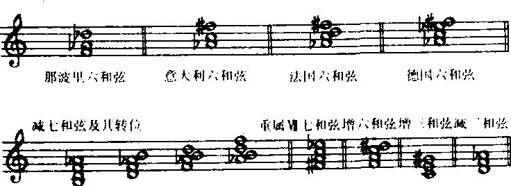 由于使用了调式以外的临时变化音而形成的有变化音的和弦。常用的变化和弦有:❶由调式Ⅱ级和弦降根音、五音而形成的大三和弦,多使用其第一转位,称为“那不勒斯六和弦”,也叫“那波里六和弦”。因两个音的变化,而使整个和弦极不稳定,常用它造成离调。❷含有增六度的和弦,常用的有“意大利六和弦”(大六和弦升根音降三音)、“法国六和弦”(小三四和弦升三音降五音)、“德国六和弦”(大五六和弦升根音降三音、七音)。❸减七和弦是和弦中某一个或两个自然音的半音变化而形成的,其特点是四个音均以小三度叠置,任何一种转位的实际音数关系一样,但在调式中的意义不同,变化和弦多数为不协和和弦,但也有协和和弦。无论是否协和,变化和弦都具有不稳定的性质,常用于转调。如: