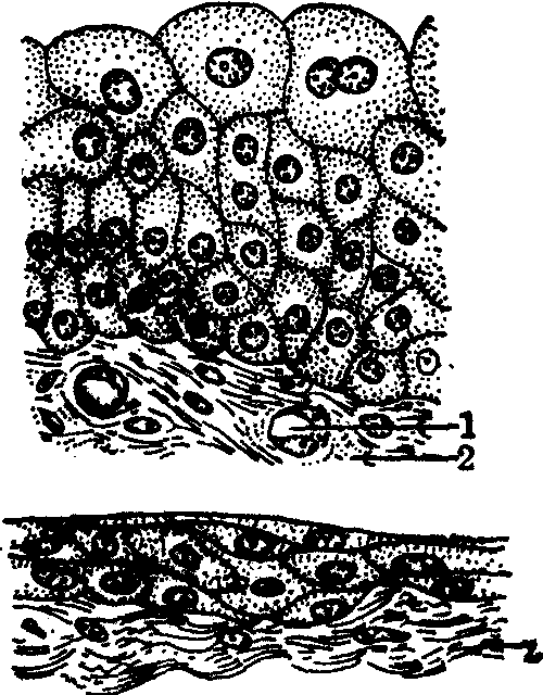 释义 | 变移上皮transitional epithelium又称移行上皮。细胞形状和上皮厚薄可随所在器官的生理状态改变而变化的一种动物体上皮。器官收缩时,细胞较高,层数变多,包括表层伞形,中间层梭形和基层锥形3种细胞。表层细胞又称盖细胞,胞质丰富常具双核,顶端胞质浓密嗜酸性强,曰壳层,能防止尿液侵蚀。传统分类归于复层上皮,现因3种细胞基底端都附于基膜,列为假复层上皮。分布于肾盏、肾盂、输尿管和膀胱等处。 变移上皮transitional epithelium上皮细胞的形状和层次随着所在器官的收缩或膨胀而发生变化,此种上皮叫变移上皮。变移上皮是一种介于复层扁平上皮和复层柱状上皮之间的过渡类型,又叫异行上皮。当器官收缩时,上皮细胞层次变多,可达5~6层,位于表层的细胞较大,呈立方形;当器官膨胀时,上皮细胞层次变少,仅有2~3层,表层细胞随之变为扁平,基底为立方形。变移上皮仅见于泌尿管道的粘膜上皮。 变移上皮 变移上皮变移上皮也名移行上皮,其原义是指介于复层鳞状上皮和复层柱状上皮之间的上皮。这种上皮只分布于肾盏、肾盂、输尿管、膀胱和尿道近段。组成上皮的细胞形状和层数随器官收缩、扩张发生变化(见图)。器官收缩时,细胞较厚或较高,有5~6层,大致可分三种: 变移上皮模式图 上图示收缩状态的上皮,下图示扩张状态的上皮 1.毛细血管 2.结缔组织 传统上将此种上皮列为复层上皮。但近年有些研究表明,表层和中间层的细胞的突起都附着于基膜,故有人将它列为假复层上皮。电镜下见到,盖细胞的浅层细胞质含许多细丝和囊泡;基底层细胞内有质膜内褶和囊泡。器官扩张时,随着细胞形状和排列的变化,细胞内的囊泡和质膜内褶变小或消失。质膜内褶和囊泡可能是器官收缩时上皮细胞保存多余细胞膜的一种方式。细丝可能防止细胞过分变形,以免细胞破坏。 ☚ 复层柱状上皮 微绒毛 ☛ |