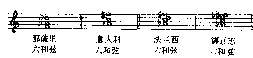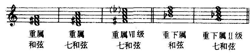 在和弦中包含有变音的,称变音和弦。在变音和弦中,如系其他调性的属和弦(包括属三和弦、属七和弦与Ⅶ级七和弦)或下属和弦(包括Ⅳ级三和弦、Ⅱ级七和弦),则称副属和弦与副下属和弦;其中来自属调的属和弦或下属调的下属和弦,又称重属和弦或重下属和弦。其他常用的变音和弦有以降低Ⅱ级音为根音的大三和弦与含有增6度音程的和弦等。降根音的Ⅱ级大三和弦常用第一转位,称为“那破里六和弦”。含有增6度的和弦很多,常用的是降低重属七和弦的五音及重属Ⅶ级减三和弦与Ⅶ级减七和弦的三音而构成的和弦。其中降低三音的重属Ⅶ级三和弦,常用第一转位,称“增六和弦”,俗称“意大利六和弦”,降低五音的重属七和弦常用第二转位,称“增三四和弦”,俗称“法兰西六和弦”;降低三音的重属Ⅶ级七和弦,常用第一转位,称“增五六和弦”,俗称“德意志六和弦”。下面是C大调中常用的变音和弦表: