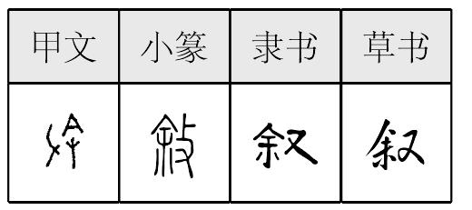 【提示】余,位于字左时,第二笔捺改点; 第六笔宋体是撇,楷体是点。 *叙〔敍 敘〕xù9画 又部 (1) 〈书〉 次序;次第:四时不失其~。 (2) 排列次序;特指按等级次第授官或按劳绩大小评奖:~功|~奖。 (3) 说;谈:~说|~谈|~家常。 (4) 记述;述说:记~|~述|~事诗。 (5) 序言(古书中多用):《说文解字·~》。 叙敘敍xù甲骨文从又从余(舍字省写),余亦声。象用手整理或修建房屋。有次序,次第义。又有排列次第义,通序字。又通绪字,有头绪,条理义。引申为陈述,记述,述说。如:把事情经过叙清楚|叙家常。又通序字,序言义。如:《汉书·叙传》|《说文解字·叙》。 叙敍★异◎异;敘★异◎常★常◎异