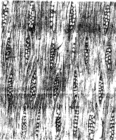 释义 | 叠生构造storied structure描述一些木材中的轴向分子及射线在弦切面上排成水平状系列,并成层状的构造。叠生出现于各种组织中,例如“叠生薄壁组织”、“叠生射线”(见图)等等。肉眼或放大镜(10倍)下,在木材的弦切面上看到有许多细的、水平的条纹,常称之为波痕或波状纹,此种波痕的出现,就是由于叠生构造引起的。在心材中比在边材中更容易看出。 黄檀的叠生构造 叠生构造系发生于叠生形成层。叠生形成层的纺锤形形成层原始细胞在弦切面上排成水平的层次,每一层细胞的端部几乎都在同一水平上。因而形成的木质部也是叠生的构造。叠生形成层的纺锤形原始细胞较非叠生的同类细胞短,且常发生在一些高度进化的双子叶植物中。叠生构造是一项重要的木材鉴别特征,它可以仅由木射线,或薄壁组织束,或纺锤形薄壁细胞,或导管分子,或纤维等排成水平系列;或由两种以上分子排成叠生。 在阔叶树材中,已有28个科的全部或部分代表种具有由射线组成的叠生构造。中国产的代表种如黄檀属、柿树、蚬木和红豆属的部分种类。在一些种类中仅是局部为叠生的,如高山榕、青檀、琼岛柿等。由轴向薄壁组织或木纤维等组成叠生构造的,已出现在52个科的全部代表种或部分代表种中。中国木材中如蚬木、黄檀属、梧桐科等木材中常由轴向薄壁组织、木纤维和导管分子排列成叠生构造。 叠生构造一般出现于一些树木生长几年后的茎部,但有时在第二年的生长层中就十分规则地出现,如蒺藜科和一些豆科的木材中。在另一些种类的木材中具有两种不同宽度的木射线,常仅有一种宽度的射线形成叠生,如木棉科、锦葵科和梧桐科中,他们的狭木射线在弦切面上排成横的行列,而宽射线则否。这些树种木材中的波痕或叠生构造只有在合适的光线下才能看清楚。 在一些高度进化的阔叶树材中常具有叠生构造,此类木材除组成分子较短外,尚具有一些进化特征,如导管分子具有单穿孔,管间纹孔式排成互列而不是梯状,木纤维常具单纹孔或不明显的具缘纹孔;射线同形且较狭,导管和薄壁组织间的纹孔对多形小。相反,在一些具原始特征的树种木材中常缺乏叠生构造。 |
