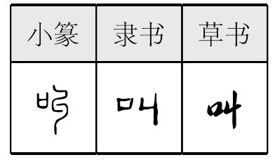 【提示】丩, 起笔是竖提, 不是一竖、一提两笔。 *叫〔呌〕jiào5画 口部 (1) 呼喊: ~喊|~好|~卖|哭~。 (2) 动物口中发出较大声音: 鸡~|狗~。 (3) 招呼;呼唤: ~车|~人开会。 (4) 称呼: 你~什么名字? (5) 使;命令: ~人为难|厂长~我去上海。 (6) 容许或听任: 不~我去,我偏要去|~他闹去,看他能闹成什么样。 (7) 介词。被: 小鸡~黄鼠狼叼走了。 (8) 〈方〉 雄性的(用于某些家畜或家禽): ~驴|~鸡。 叫 ☚ 吟 吝 ☛ 叫呌jiào古代形声字。从口,丩 (纠的本字)声。呼喊义。如:大叫一声。“呌”从口从斗是近代的异体字或讹体,现作为异体字。“叫”为规范字。见《异体字表》。引申指动物发出声音。如:鸡叫。又引申为称呼,称为。如:他叫什么名字? |这叫机关枪。再引申为召唤。如:叫他明天来。又引申为使,令。如:这件事应该叫他知道。又用为“被”。如:敌人叫我们打败了。 叫★常◎常