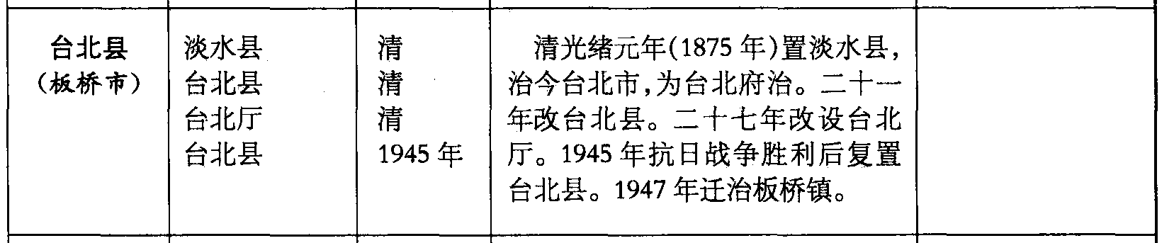 台北县(板桥市)淡水县台北县台北厅台北县清清清1945年清光绪元年(1875年)置淡水县,治今台北市,为台北府治。二十一年改台北县。二十七年改设台北厅。1945年抗日战争胜利后复置台北县。1947年迁治板桥镇。