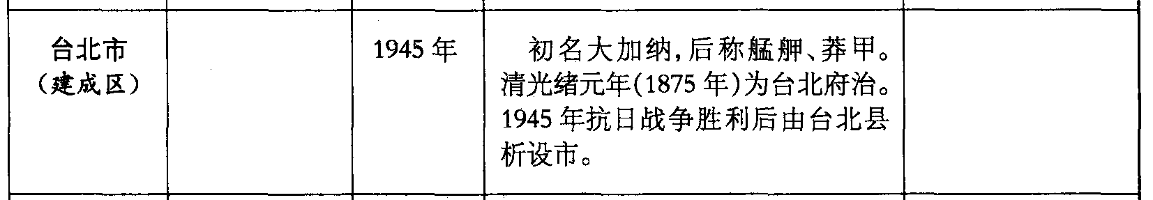 台北市(建成区)1945年初名大加纳,后称艋舺、莽甲。清光绪元年(1875年)为台北府治。1945年抗日战争胜利后由台北县析设市。