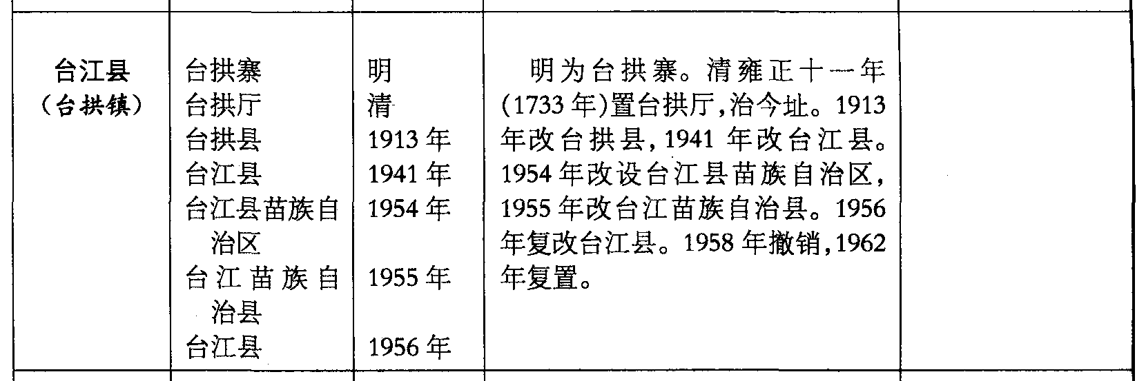 台江县(台拱镇)台拱寨台拱厅台拱县台江县台江县苗族自治区台江苗族自治县台江县明清1913年1941年1954年1955年1956年明为台拱寨。清雍正十一年(1733年)置台拱厅,治今址。1913年改台拱县,1941年改台江县。1954年改设台江县苗族自治区,1955年改台江苗族自治县。1956年复改台江县。1958年撤销,1962年复置。
