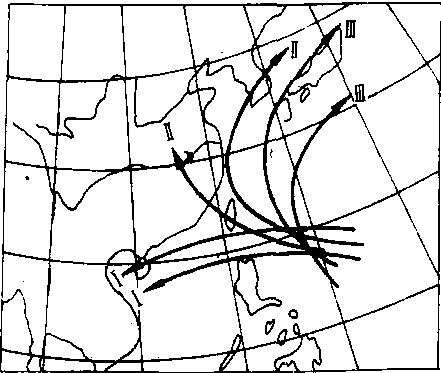 台风移动基本路径 Ⅰ-偏西路径 Ⅱ-西北路径 Ⅲ-转向路径 台风路径台风中心移动的路径。见“热带风暴路径”。 |