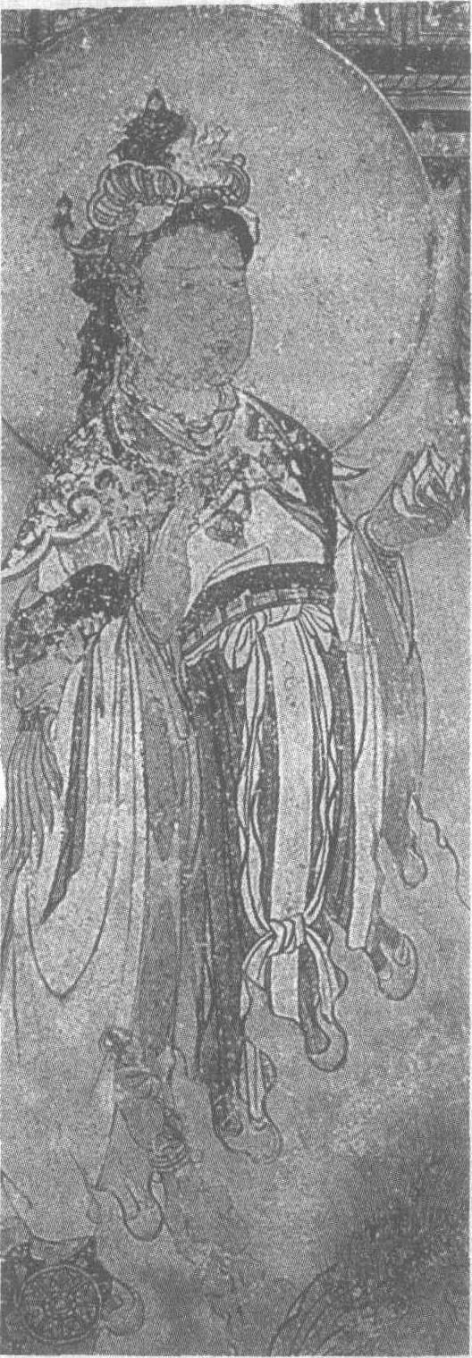 释义 | 吉祥天图壁画 吉祥天图壁画元。甘肃省敦煌县莫高窟第3窟北壁西侧壁画。吉祥天又名辩才天,功德大,是帝释天之女,多闻天之妃,聪慧有辩才,善歌詠,司国家安泰及个人福德。图中吉祥天梳高髻,戴花冠,着云肩羽袖大带裙襦。左手捧莲花,右手扬起作施与状。她的面庞丰圆,五官精巧秀丽,双眉紧锁,凝视前方,一副若有所思的神态,俨然是一位端庄、聪颖女子形象。人物轮廓线条圆润,衣纹舒展自然,具有飘垂的质感,是一幅优秀的人物肖像画。 ☚ 锻铁图壁画 千手千眼观音像壁画 ☛ |