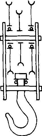 吊钩与动滑轮组的组合体。为起升机构常用的取物装置。按结构特点分两种:❶长型吊钩组。吊钩轴与滑轮轴分开,平行地安装在两块拉板上,整个高度尺寸大。❷短型吊钩组。吊钩与滑轮安装在同一轴上,省去了拉板,整个高度尺寸小,但滑轮数只能取偶数。前者使用在大中起重量,后者只用于小起重量。