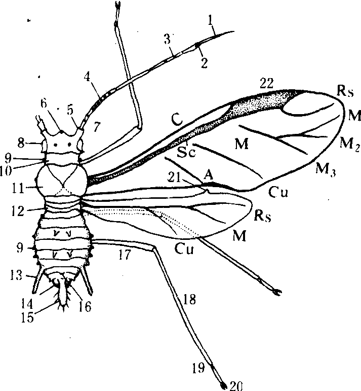 胸喙亚目 喙似起于前足基节之间,跗节1或2节,触角长而线状,无端芒,若干种类无触角,翅脉常退化。雌虫一般无产卵器,不能把卵产在植物组织内,全是不善活动的种类。这个亚目是个广泛的人为类群,目前可分为4个总科: 木虱总科 体长仅3毫米左右,形似小蝉,比较活泼,触角9~10节,一般10节,端节有2细毛,喙分3节,跗节2节,翅脉退化。雌虫除保留有3对产卵瓣外,生殖节背腹板成鸟喙状。后足腿节膨大,能跳跃。常见种有为害桑树的桑木虱可使幼叶卷缩,甚至枯落:为害梨和苹果树叶的梨木虱等(见梨木虱)。 粉虱总科 体长仅1~2毫米。身体和翅上被有白蜡粉,单眼2个,位于复眼的上方,触角7节,喙3节,跗节2节,翅脉甚退化。若虫4龄,第一龄活泼、可以爬行,第二至四龄固定于植物上不活动,很像介壳虫,4龄若虫后期不取食,近似于“蛹”,称“伪蛹”。可进行产雄或产雌的孤雌生殖,经交配的雌虫所产未受精卵孵化为雄虫,受精卵孵化为雌虫,而未经交配的雌虫,所产的卵均孵化为雌虫。重要害虫有烟粉虱、黑刺粉虱和温室白粉虱等,其中温室白粉虱在保护地及其附近的蔬菜和花卉等植物上为害甚重。 蚜总科 体长1~7毫米,大都2毫米左右。触角3~6节,喙4或5节,跗节2节,第一节甚小,有时跗节仅1节甚至退化。有翅型具翅2对,翅脉退化,有翅痣。腹部第五或六背片常有一对腹管,一般缺产卵器(图2)。若虫4~5龄。 图2 蚜虫