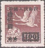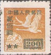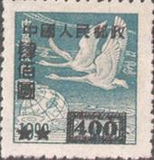 释义 | “中华邮政飞雁图基数邮票”加字改值 发行日期:1950年8月1日 齿孔度数: 印刷版别:胶版 图幅:18×21 印刷:(2)(3)上海三一印刷公司,其余大东书局上海印刷厂 加盖全张枚数:50(10×5) 加盖:上海三一印刷公司 飞雁图 (1)50元(红)/1角(深蓝) (2)100元(蓝)/1角6分(橄绿、无齿) (3)100元(蓝)/5角(草绿、无齿) (4)200元(绿)/1元(红棕) (5)200元(紫红)/2元(蓝) (6)400元(黑)/5元(玫红) (7)400元(黑)/10元(蓝绿) (8)400元(黑)/20元(紫) (1)-(8) 8枚全 |