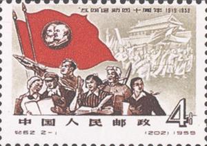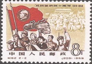 释义 | “五·四”运动四十周年 发行日期:1959年7月1日 齿孔度数: 印刷版别:影写版 图幅35.5×25.5 全张枚数:50(5×10) 设计者:钟涵 版图绘制者:孙传哲 印刷厂:北京邮票厂 (1)4分 向科学技术进军 277.5万枚 (2)8分 奋勇前进 455万枚 (1)-(2) 2枚全 |