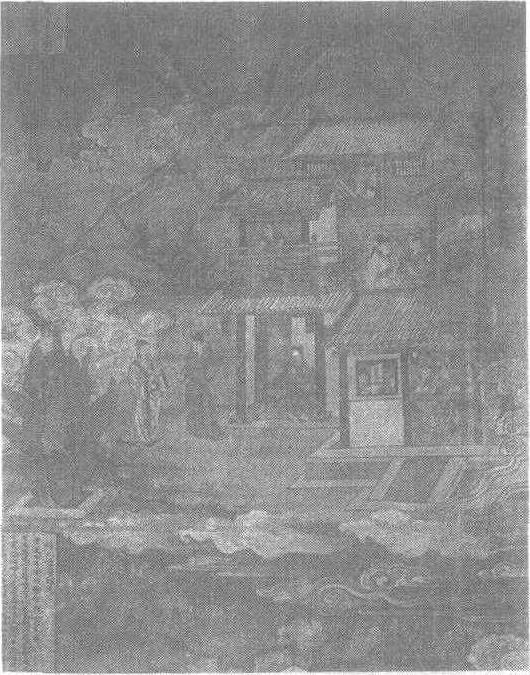 释义 | 吕洞宾故事图(神化赵相公)壁画 吕洞宾故事图(神化赵相公)壁画元。纵165厘米,横131厘米。山西省芮城县永乐宫纯阳殿西壁中部壁画。山峦之下的一块平地上房舍栋栋,近处是赵相公宅第。宅第为两层,底层门下一孩童双手捧书而立,门前装点着芭蕉、山石,吕仙度相公学道。二层有一孩童在廊间攀栏戏耍,相公与夫人相叙。后排房子的二层阁内一女子侧身向外张望。宅第右侧为私塾,几个学生坐在摆有书籍的案旁私语,私塾先生一卷在手,身前的一个学生正在背诵。另一穿红衣的学生在躬身施礼,准备接受先生的考查。作者生动地描绘出山间房舍,并将瞬间人物活动情形予以定格表现,生活气息浓厚,使人感到自然真实。 ☚ 吕洞宾故事图(钟离权度吕洞宾)壁画 朝元图(南极长生大帝)壁画 ☛ |