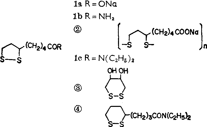 释义 | 含硫辐射防护剂 含硫辐射防护剂一些含硫化合物,在动物试验中,能减轻辐射效应一半左右,一般在照射前给药才有效果。这类药曾试用于放疗病人,可分为以下几类。 (2) 环状双硫化合物: 有二硫杂五元环化合物如硫辛酸钠1a,硫辛酰胺1b等硫辛酸类化合物。其中聚硫辛酸钠 ❷对于受照射动物的造血组织损伤有防护作用,照后应用也有一定效果; N,N-二乙基硫辛酰胺1c则安全系数大,不良反应小。二硫杂六元环化合物如二硫代苏糖醇 ❸,N,N-二乙基-5,8-二硫辛酰胺 ❹均有防护效果,后者更为明显,并且照后应用也有一定作用。 (3) 其它含硫化合物: 有二硫氨甲酸盐类 (RNHCSSM),2,3-二巯基丙醇(HSCH2CH(SH)CH2OH),1,2-二巯基丙磺酸钠 (HSCH2CH(SH)CH2SO3Na),巯基乙酸(HSCH2COOH)等。近年发现巯基或双硫代脂肪酸衍生物也有效,其中2-巯基丙酰甘氨酸(CH3CH(SH)CONHCH2COOH)毒性较低。 ☚ 辐射防护剂 胺类辐射防护剂 ☛ |