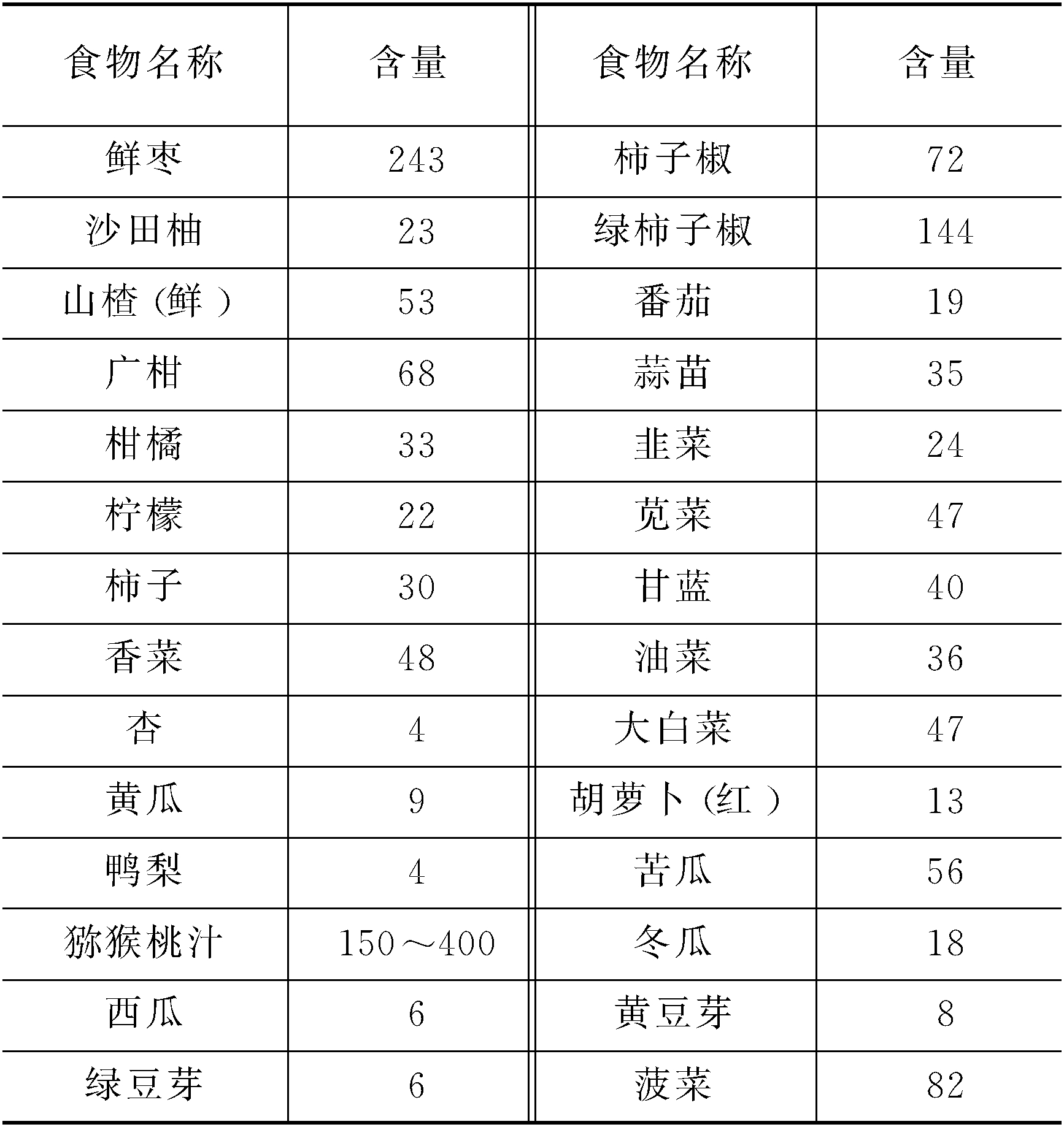 释义 | 含维生素C较丰富的食物维生素C又称抗坏血酸。供给量成人每人每天为60 mg,孕妇为80 mg,乳母为100 mg。广泛存在于新鲜蔬菜和水果中。含维生素C较丰富的食物见下表(以100g计,单位:mg): |