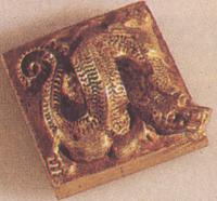 ◎御印/西汉 1983年10月广东广州象岗山西汉南越王赵眜墓出土 通高1.8厘米 重148.5克 金/广东省广州市南越王墓博物馆藏 ●“文帝行玺”金印由纯金铸成,呈正方形。 印纽为一盘龙,龙首上翘于一角,龙尾曲盘如钩于对角,腰背向上弓起。印纹为阴刻篆书“文帝行玺”四字。 此印为迄今所见西汉最大的金印。 以龙为纽有象征皇权至尊的含义。 金龙弓起的背脊,既利于手持,又强化了S形龙身翻转舞动的感觉,设计巧妙,实用功能和装饰效果集于一身。金龙通体遍饰的波曲状鳞纹,其闪烁的光彩,更使金印增加了几分富丽华贵。 |