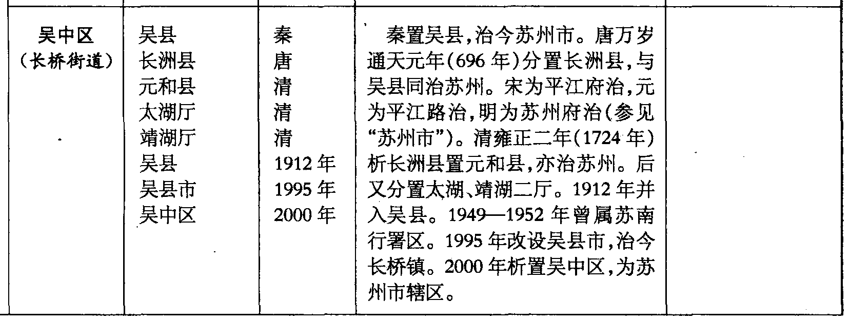 吴中区(长桥街道)吴县长洲县元和县太湖厅靖湖厅吴县吴县市吴中区秦唐清清清1912年1995年2000年秦置吴县,治今苏州市。唐万岁通天元年(696年)分置长洲县,与吴县同治苏州。宋为平江府治,元为平江路治,明为苏州府治(参见“苏州市”)。清雍正二年(1724年)析长洲县置元和县,亦治苏州。后又分置太湖、靖湖二厅。1912年并入吴县。1949—1952年曾属苏南行署区。1995年改设吴县市,治今长桥镇。2000年析置吴中区,为苏州市辖区。