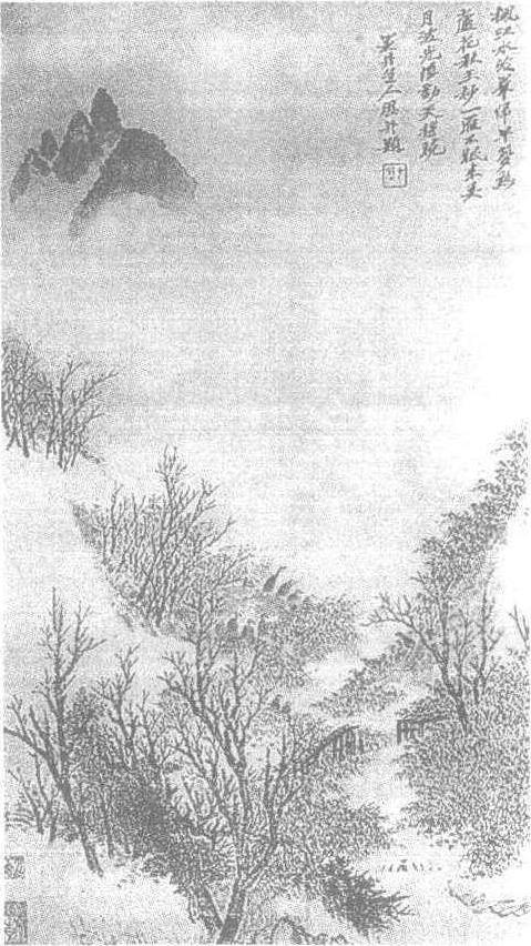 纸本,设色。纵46.5厘米,横26.2厘米。现藏南京博物院。此画描写的是深秋景色,树木叶几乎已脱尽,只有红叶在泛着褐红色。明月高悬,画面中部大部分空白,一只孤雁向着月亮方向飞去。远山只露几个山头,大部被云雾遮蔽。卧在芦苇中的群雁被突然高飞的孤雁的行动弄得慌了神。画面自题诗 “枫江水冷群归早,梦熟芦花秋未杪。一雁不眠来弄月,波光浮动天将晓。”此画用浓墨干笔,枯涩的笔痕,与深秋的天高气爽氛围相呼应。