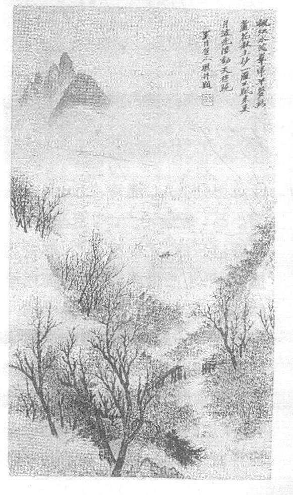 释义 | 吴历枫江群雁图页 吴历枫江群雁图页清。吴历(见《吴历湖天春色图轴》条目)绘。纸本设色。纵46.5厘米,横26.1厘米。江苏省南京博物院藏。此幅描绘了江野秋景。画面下部几棵落光了叶子的杂树,只剩下枯枝老干,丛林中的枫叶已经变成了黄褐色,喻示着时已深秋。溪水浅淡无声,静寂地流淌。溪边芦草丛生,水上木桥已经腐断。画面中部稀疏的乔木和密布的芦苇分列左右,排成V形,中间部分却是空荡荡的,泛出淡青色,依稀是秋夜中浩茫的江水,透出一股寒意。就在这空寥的背景上,一只大雁突然飞起,栖于坡地和芦苇丛中的雁群被它惊醒,有的伸颈张望,有的扭头回顾,神态非常生动。画面左上角云雾遮掩处露出几角峰尖,与近处景物相呼应,增加了辽阔深远的感觉。林木用干墨短笔细皴,苍老简淡;远山用淡墨烘染,朦胧而悠远。大雁只寥寥数笔就描绘出了绒毛的质感与生动的神态。画面的色调比较暗淡、清冷,呈现一种深秋晨曦的景象。但雁群的描写给这冷寂的自然注入了一股活力,尤其是那只向月直飞的孤雁,表现出一种执著的精神,情态感人。画上自题诗曰:“枫江水冷群归早,梦熟芦花秋末杪;一雁不眠来来月,波光浮动天将晓。”诗画相配,作者的意趣表达得更加完美,此幅是吴历为他的好友,苏州兴福寺默容禅师而作。 ☚ 王翚仿李营丘古木奇峰图轴 恽寿平锦石秋花图轴 ☛ |