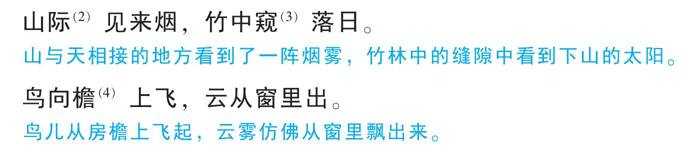 山际(2)见来烟, 竹中窥(3)落日。 鸟向檐(4)上飞, 云从窗里出。