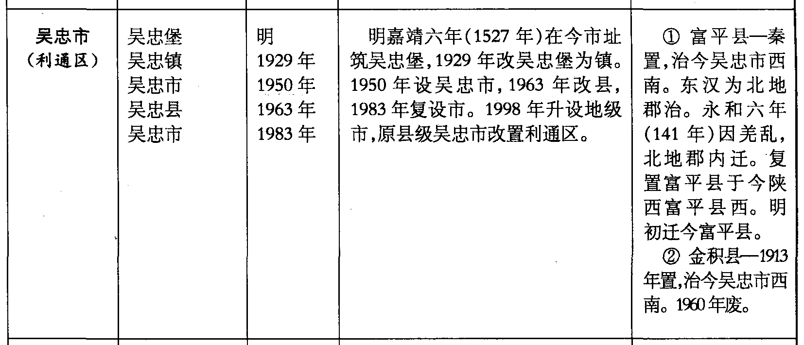 吴忠市(利通区)吴忠堡吴忠镇吴忠市吴忠县吴忠市明1929年1950年1963年1983年明嘉靖六年(1527年)在今市址筑吴忠堡,1929年改吴忠堡为镇。1950年设吴忠市,1963年改县,1983年复设市。1998年升设地级市,原县级吴忠市改置利通区。❶ 富平县—秦置,治今吴忠市西南。东汉为北地郡治。永和六年(141年)因羌乱,北地郡内迁。复置富平县于今陕西富平县西。明初迁今富平县。❷ 金积县—1913年置,治今吴忠市西南。1960年废。