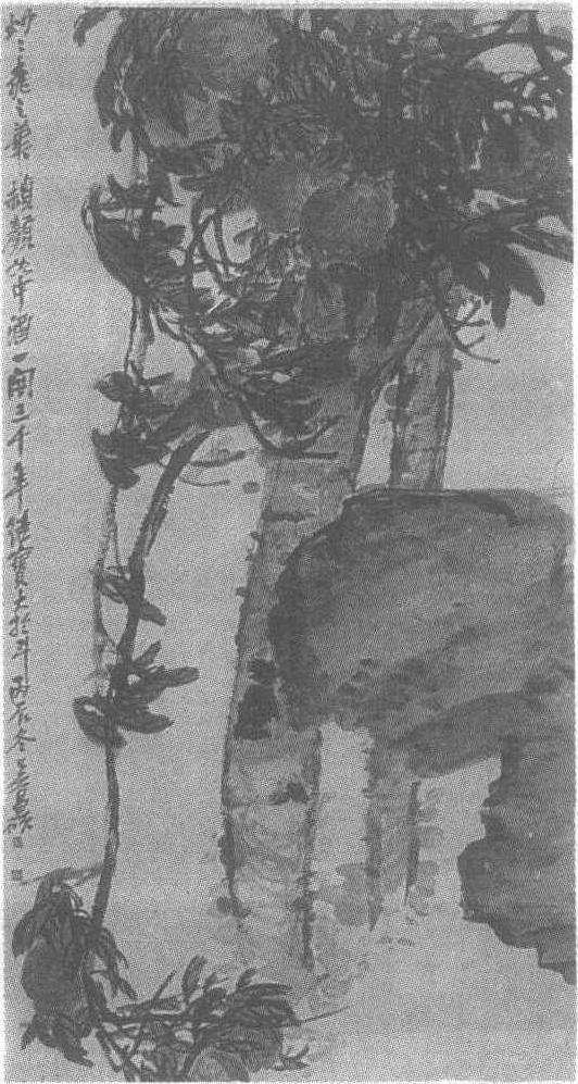 释义 | 吴昌硕桃实图轴 吴昌硕桃实图轴清。吴昌硕绘。纸本设色。纵180厘米,横96厘米。上海博物馆藏。吴昌硕为海派的代表人物,此幅一块奇石立于画面右部,石旁二棵粗壮苍老的桃树相依而立,枝叶茂盛,果实累累。桃树的枝叶被劲风吹得倒向了一边,其中一枝被几颗硕大的桃实压弯,垂到了地下。石块与繁枝、果实等同在画面的中部和上部,左下角留下了一块空白。画家以倒偃于地的枝、果、巧妙地填补了这块空缺,右下角则用了一方小小的朱印,稳定了画面,构图奇绝,险中生夷。石块以淡墨渴笔皴擦,染以花青,凝重有力。树干笔法豪放,笔到意尽,细长的枝条在画家写来如作字一般,有篆书笔意,游刃自如,功力深厚,劲透纸背。巨石的灰青、枝叶的浓墨与熟透的桃红,形成色块间的强烈对比,奔放飘逸,独具特色。画家把危然不动的顽石与充满生命力的桃树处理在一起,一静一动,亦匠心别具。左侧作行书长题曰:“灼灼桃之华,赪颜如中酒。一开三千年,结实大于斗。丙辰冬吴昌硕。”钤<俊卿之印>、<昌硕>白文印。“丙辰”为公元1916年,吴昌硕时年72岁。 ☚ 吴石仙秋山夕照图轴 吴昌硕梅花图轴 ☛ |