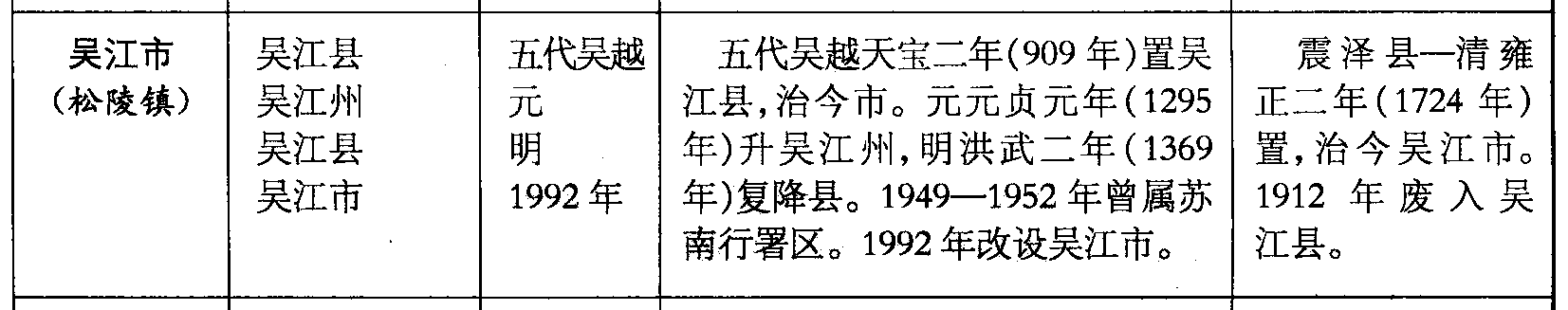 吴江市(松陵镇)吴江县吴江州吴江县吴江市五代吴越元明1992年五代吴越天宝二年(909年)置吴江县,治今市。元元贞元年(1295年)升吴江州,明洪武二年(1369年)复降县。1949—1952年曾属苏南行署区。1992年改设吴江市。震泽县—清雍正二年(1724年)置,治今吴江市。1912年废入吴江县。